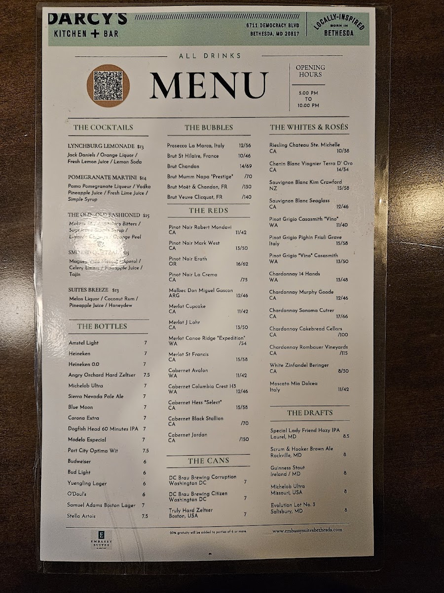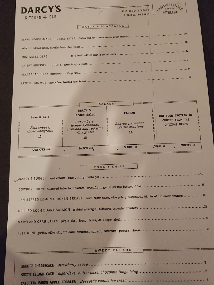 For those craving a more refined meal, the Darcy's Burger and Cowboy Ribeye are top picks, with Maryland Crab Cakes being a local favorite. The Grilled Loch Duart Salmon and Pan-Seared Lemon Chicken Breast offer lighter yet equally delicious alternatives. In the "Quick + Shareable" section, you’ll find treats like the Mini Mo Sliders and Warm House-Made Pretzel Biti S.
