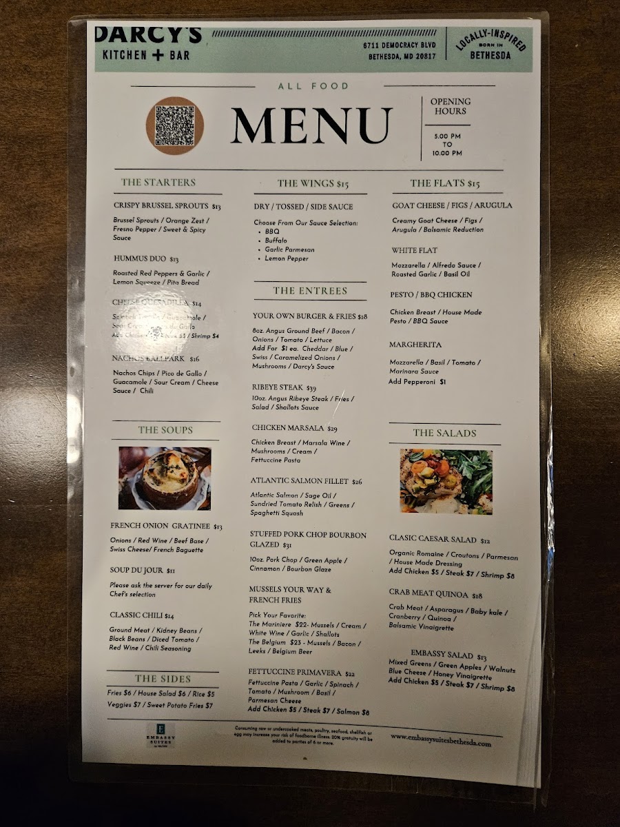In all, Darcy's Bar & Kitchen delivers a well-rounded menu with something for everyone, whether you're in the mood for a quick bite, a light meal, or a full-course experience.